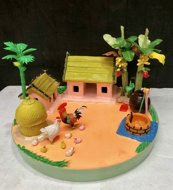 | A tò he creation depicting a typical Northern Vietnamese house, accompanied by familiar images of a flock of chickens, areca and banana trees, a water well, and a haystack, serves as a vivid symbol of rural culture in the Red River Delta. — Photo courtesy of Làng Tò He |