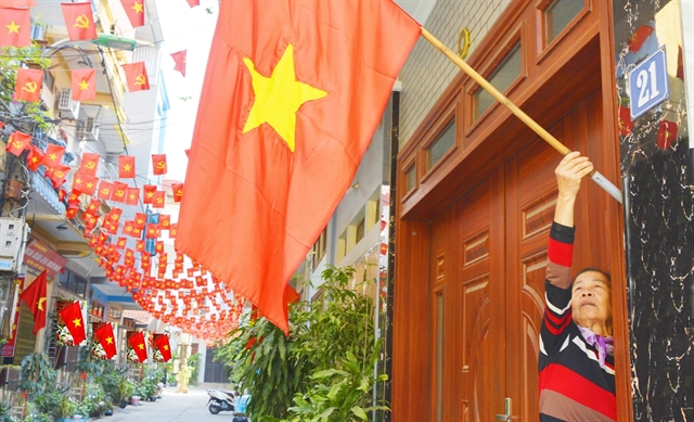 | A resident in Kinh Bắc Ward, the northern province of Bắc Ninh, hangs the national flags to welcome the 14th National Party Congress. — VNA/VNS Photo |