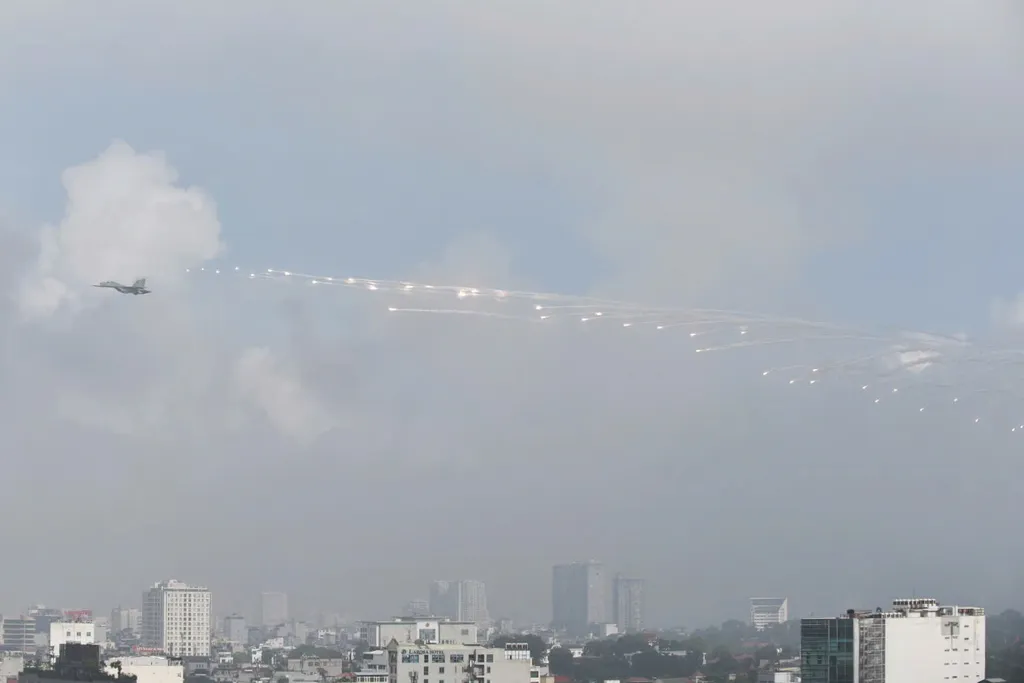 | Su-30MK2 fighter jet dropping a glowing flare, or heat trap, in the sky of the capital on September 2. — VNS Photo Nguyễn Long |