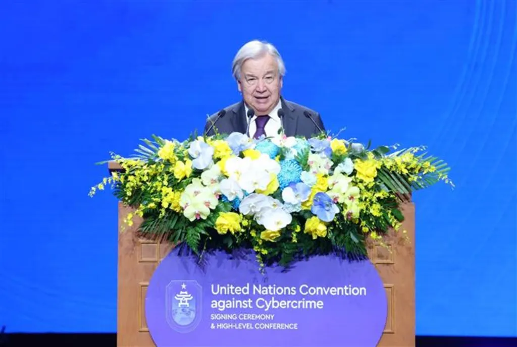 | United Nations Secretary-General António Guterres delivers remarks at the opening session of the signing ceremony of the United Nations Convention against Cybercrime (also known as Hanoi Convention). — VNA/VNS Photo |