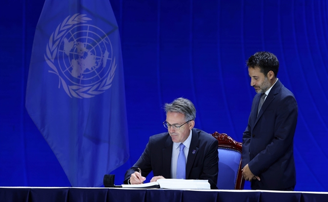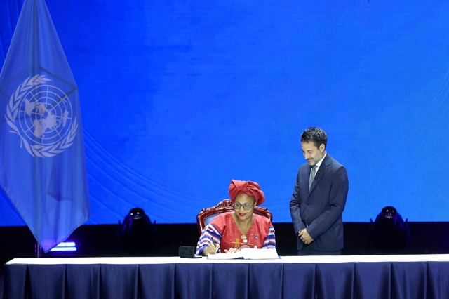 UN Secretary-General Antonio Guterres and Việt Nam's State President Lương Cường, who co-chaired the signing ceremony and the high-level conference, witnessed the signing of member states.
