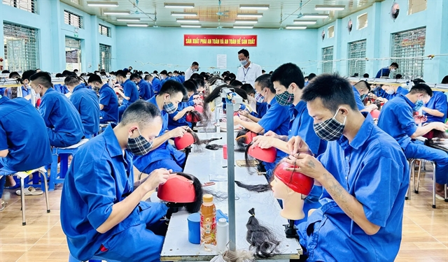 | Rehabilitation trainees at a treatment centre learn to attach wigs to mannequins as part of an occupational therapy programme. — Photo kinhtedothi.vn |