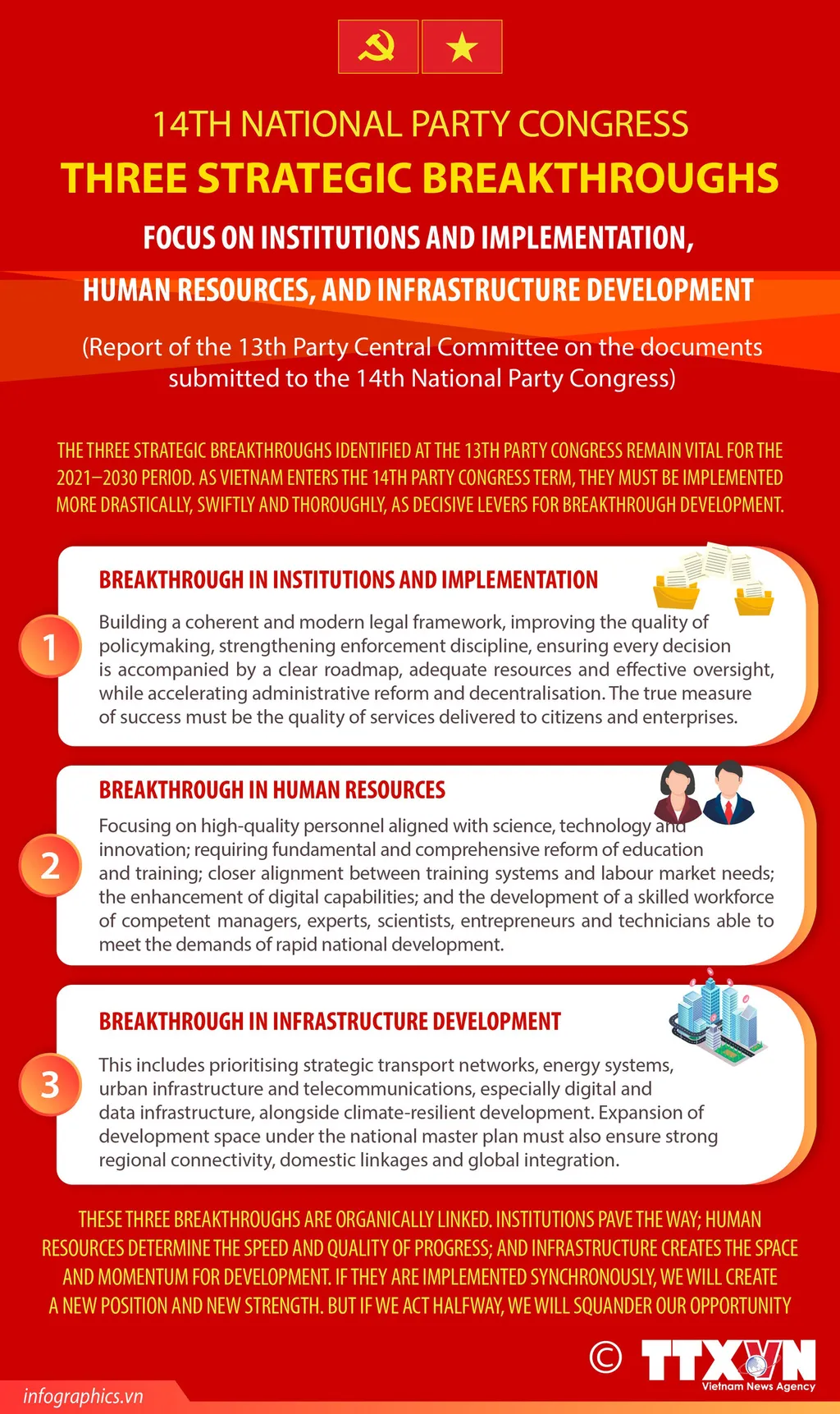 The three strategic breakthroughs identified at the 13th Party Congress remain vital for the 2021–2030 period. As Việt Nam enters the 14th Party Congress term, they must be implemented more drastically, swiftly and thoroughly, as decisive levers for breakthrough development.