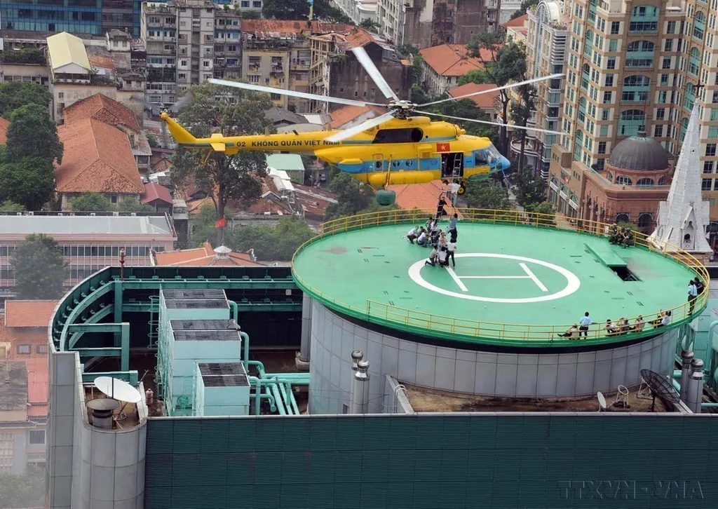 | Aircraft of the 917th Helicopter Regiment, Đồng Tháp Unit (370th Division), participate in a national fire-fighting and search and rescue exercise in Hồ Chí Minh City on August 14, 2013, aimed at responding to major disaster scenarios in high-rise buildings. |