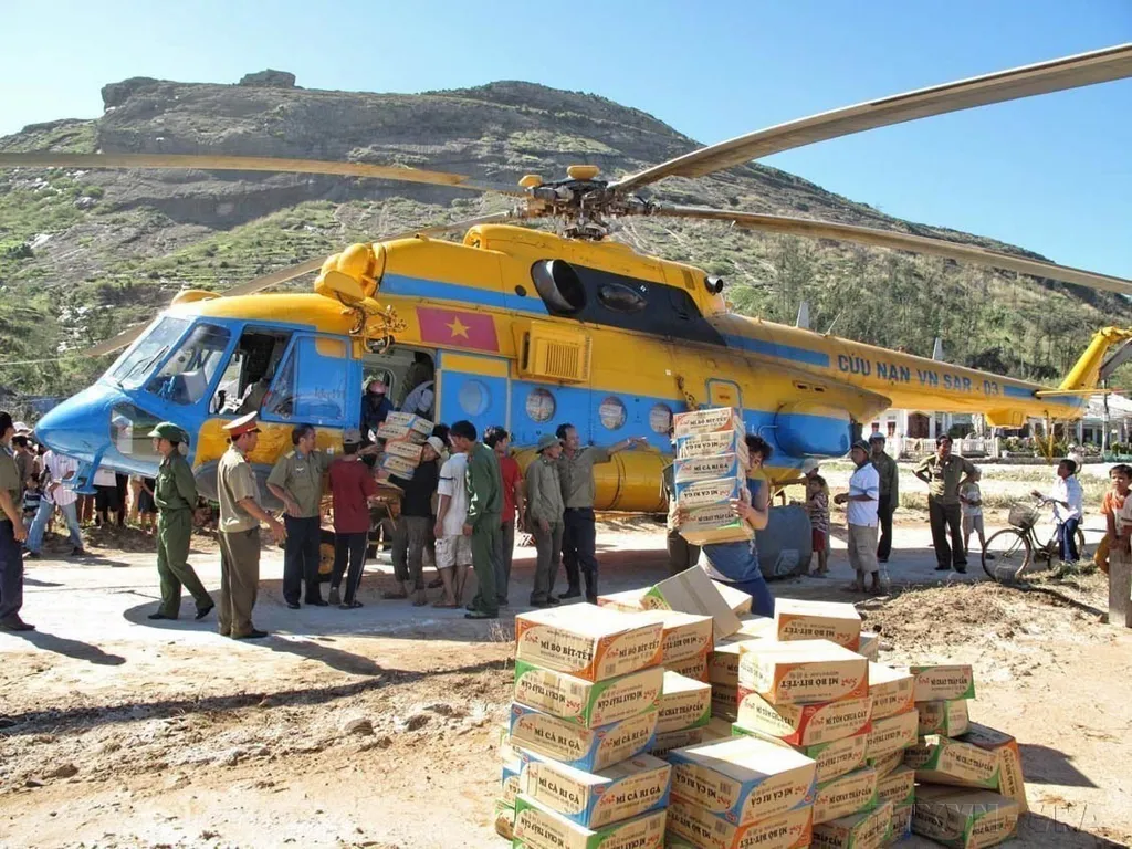 | A helicopter of the 372nd Air Division delivers 560 boxes of instant noodles to residents of Lý Sơn Island District, Quảng Ngãi Province, affected by Typhoon No. 9 on October 30, 2009. |