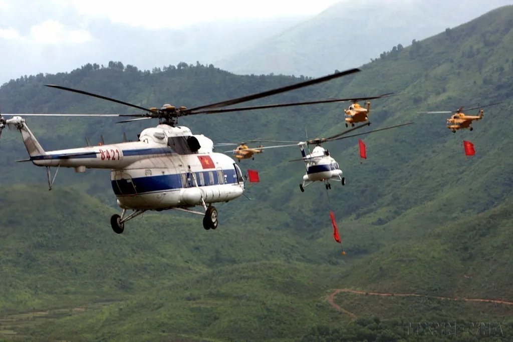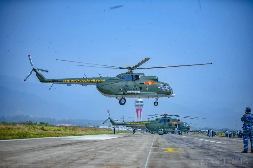 | Eleven Việt Nam Air Force helicopters arrive at Điện Biên Airport to prepare for the parade marking the 70th anniversary of the Điện Biên Phủ Victory (2024). |