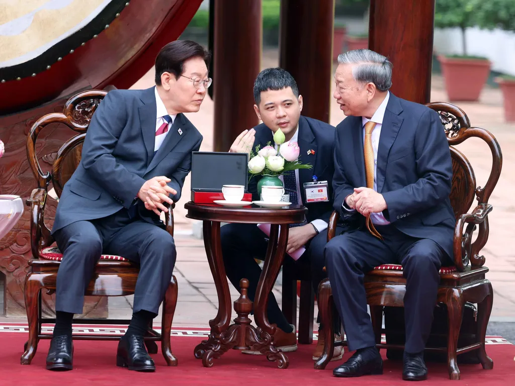 | Party General Secretary and State President Tô Lâm holds a friendly conversation with President of the Republic of Korea Lee Jae Myung. |