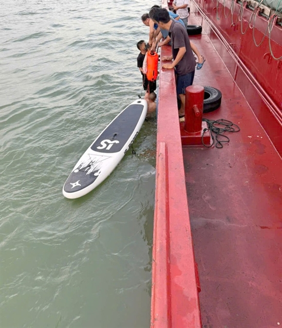 At around 6:30am on Thursday, a cargo vessel travelling from Ninh Bình to Quảng Ngãi spotted the father and daughter clinging to their kayak near Mắt Island. The crew threw life buoys and safely brought them aboard.