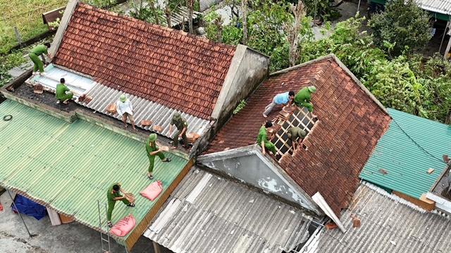 | Police forces help re-roof local residents' houses in Lộc Hà Commune, Hà Tĩnh Province after the storm.—VNA/VNS Photo Hữu Quyết |