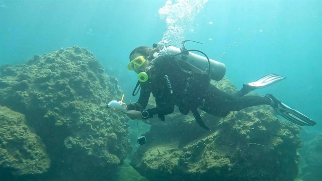 Diving deep down taking notes of corals growing stages. Photo tienphong.vn |
