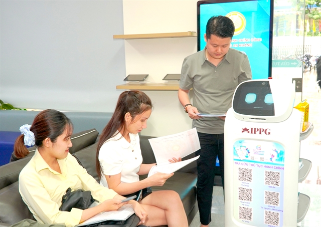 An AI robot in HCM City’s An Khánh Ward hands out forms to visitors and apprises them about administrative procedures. – VNA/VNS Photo Hữu Duyên |