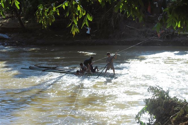 In the middle of the stream, where the current is strong and the water deep, villagers cross on bamboo rafts without life jackets or safety equipment. To get the bamboo rafts across the Nậm Ngân Stream, one has to pull on ropes by hand. VNA/VNS Photos |