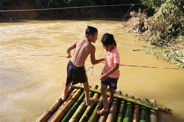 Children in Canh Hamlet, Nga My Commune, bathe in the stream where the footbridge was swept away by floods, and climb onto rafts to pull themselves across the Nậm Ngân Stream. |