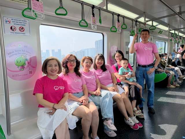 Passengers on the pink train running on the Cát Linh - Hà Đông metro line in Hà Nội, creating an impressive image to raise awareness of early detection.— Photo courtesy of the Bright Future Fund |