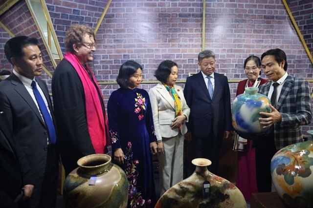 | Vice Chairwoman of the National Assembly Nguyễn Thị Thanh, ViceChairman of Hà Nội's People’s Committee Nguyễn Mạnh Quyền and delegates visit the Bát Tràng ceramics exhibition space. |