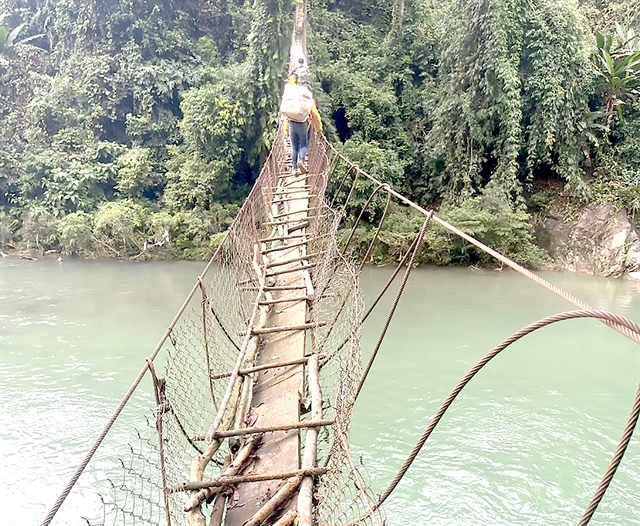 | The make-shift bridge the students and teachers of Ông Yen School use every day to go to school. — Photo giaoducthoidai.vn |