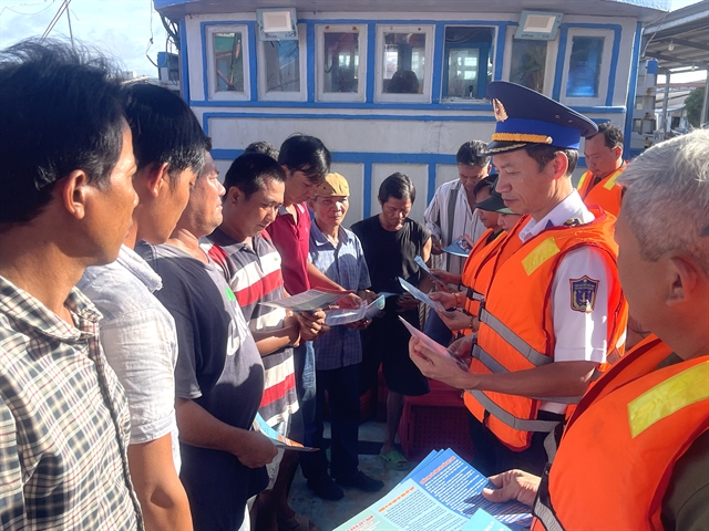 | Coast Guard Region No. 3 Command officers distribute leaflets to fishermen to raise awareness of regulations against illegal, unreported and unregulated (IUU) fishing. — Photo Courtesy of Việt Nam Coast Guard |