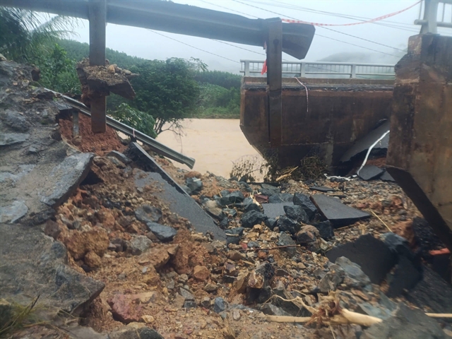 | The Ca Da Bridge on National Highway 24C was partially swept away by floodwaters on October 29, cutting off traffic. |