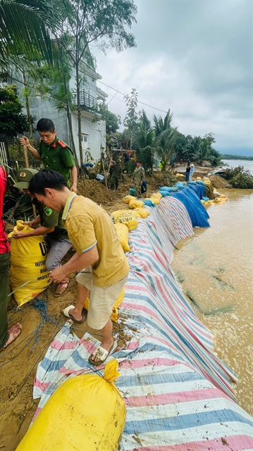 | Rescue forces put sand-bags to reinforce a dyke section in Tĩnh Yên village from serious erosion in flood. Photo courtesy of Đà Nẵng City's Centre for Flood and Storm Prevention Centre |