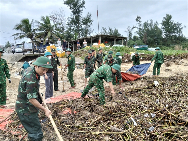 | Soldiers of Đà Nẵng City's Border Guard force help clean up garbage in a commune of Đà Nẵng City after the historic flood hit the city and other provinces in central Việt Nam. More donations and supportive programmes have been sent to the flood-affected regions. Photo courtesy of Đà Nãng City's Centre for Flood and Storm Prevention |