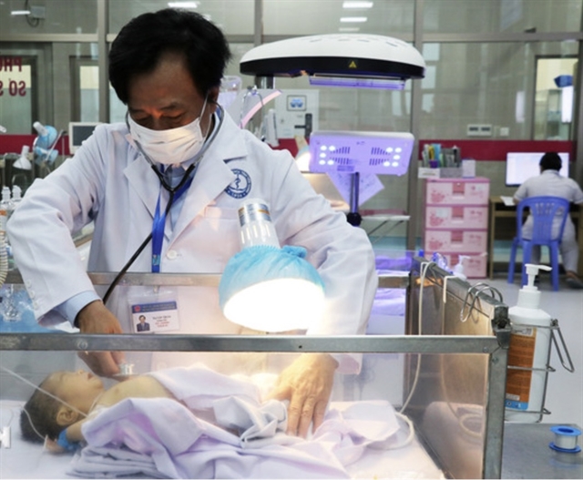 | Doctor Tạ Văn Trầm examines an infant infected with dengue fever. VNA/VNS Photo |
