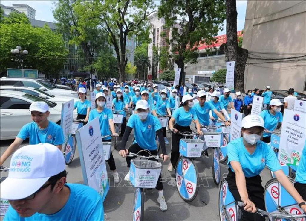 | Students from the Vietnam Youth Academy participate in a bicycle rally to mark World No Tobacco Day. Photo: VNA |