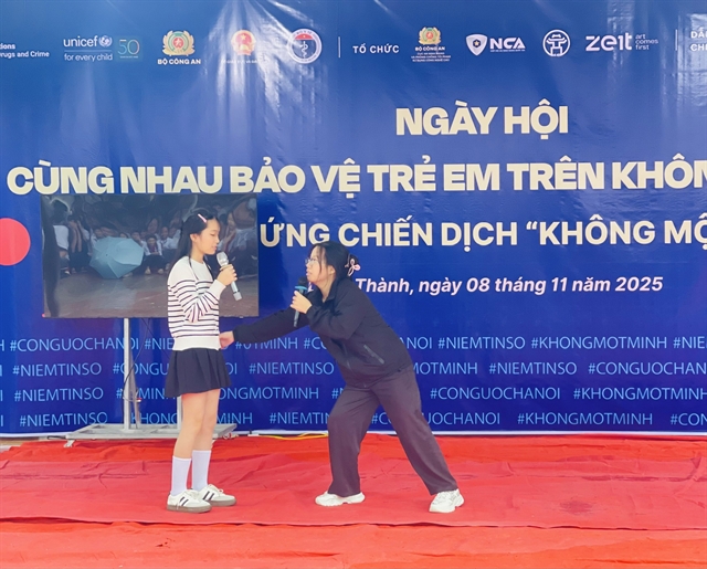 | Students participate in a short play about the risks and benefits of the internet in a festival about protecting children in cyberspace as part of the “Not Alone – Online Safety Together” campaign. — VNS Photo Thu Trang |