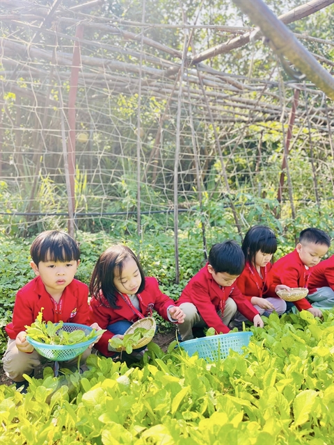 | Children learn how to grow green vegetables at Tuệ Viên Organic Farm in Long Biên Ward. |