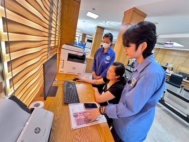 | Youth Union members of Tân Yên Commune in Bắc Ninh Province guide residents in searching and resolving administrative procedures at the commune's Public Administrative Service Centre. — Photo courtesy of Bắc Ninh Province |