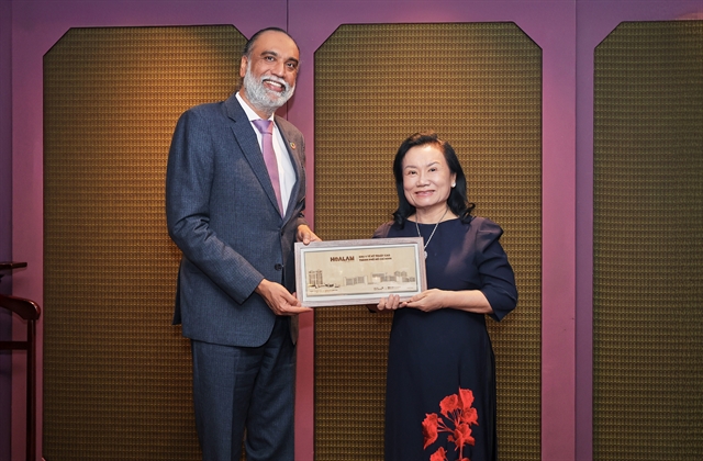 | Madam Trần Thị Lâm, founder of Hoa Lâm Group, presents a commemorative gift to Amandeep Singh Gill, United Nations Under-Secretary-General and UN Secretary-General’s Envoy on Technology, during the dialogue in Hà Nội on January 16. |