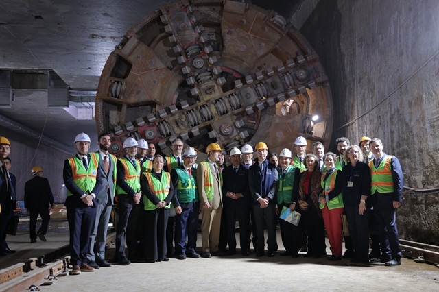 | EC President Antonio Costa, EU Ambassador Julien Guierre, and delegates at the underground tunnel of Hà Nội Metro Line 3.1 on January 29. — VNS Photo Khánh An |