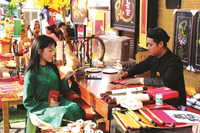 | A young woman in áo dài watches a calligrapher at HCM City’s Calligraphy Street. Resolution 80 seeks to preserve and elevate cultural values. — VNA/VNS Photo Thu Hương |