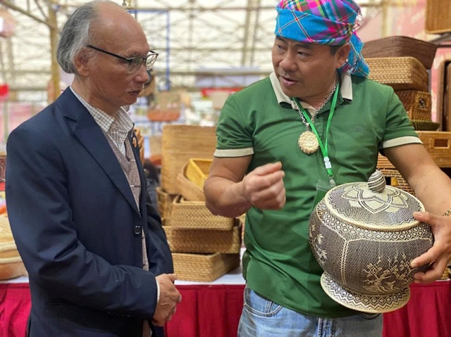 | Nguyễn Văn Hoa, a representative of Thu Linh Production Facility from the Phú Vinh bamboo and rattan craft village in Chương Mỹ Commune in Hà Nội, introduces products to customers.— VNA/VNS Photo |