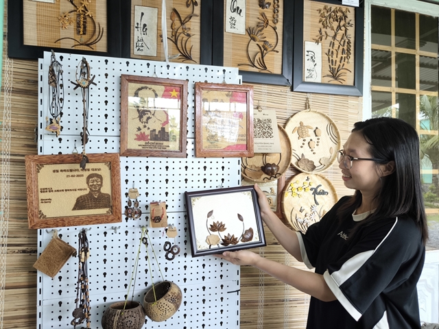 | Nguyễn Băng Nhi, owner of the Cocohand coconut handicraft workshop in Vĩnh Long Province’s Hương Mỹ Commune, with her products made from coconut shell. — VNA/VNS Photo Huỳnh Phúc Hậu |