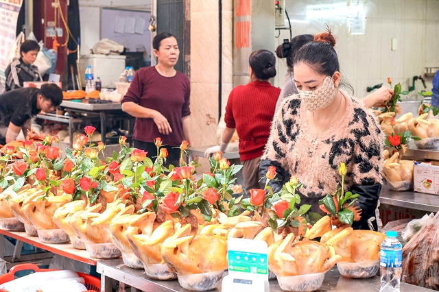 | Chickens with their wings tied in a flying pose and a rose in their beak are widely sold at Hàng Bè Market and are an indispensable item on the Hà Nội family's Tết offering tray. According to tradition, during Tết, every family prepares a respectful offering tray to present to their ancestors and the deities. — VNA/VNS Photo Hoàng Hiếu |
