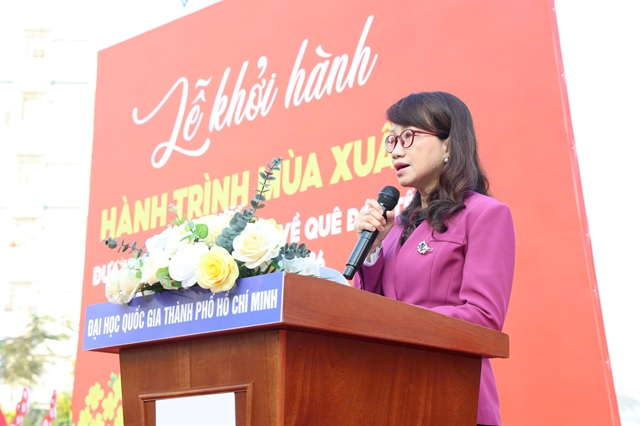 | VNU-HCM chancellor Prof Nguyễn Thị Thanh Mai delivers a speech at the send-off ceremony for the “Spring Journey” programme on February 8 to support disadvantaged students returning home for Tết. — Photo Courtesy of VNU-HCM |