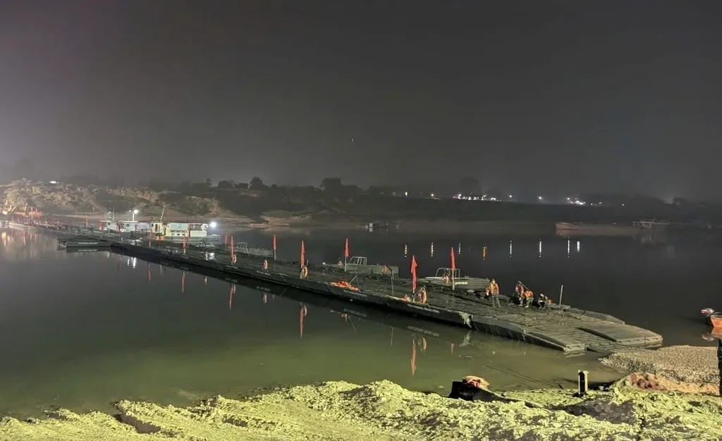 | Military personnel inspect the installation of the pontoon bridge on the evening of February 15. |