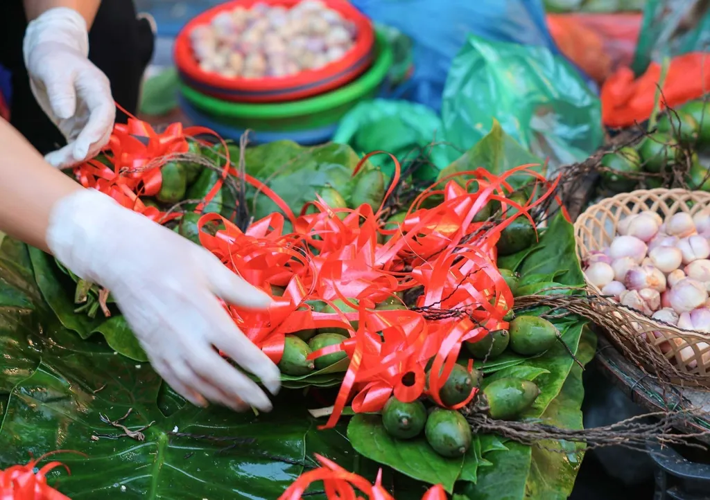 | Green banana hands and pomelos with intact stems and leaves are carefully chosen for placement on ancestral altars. |