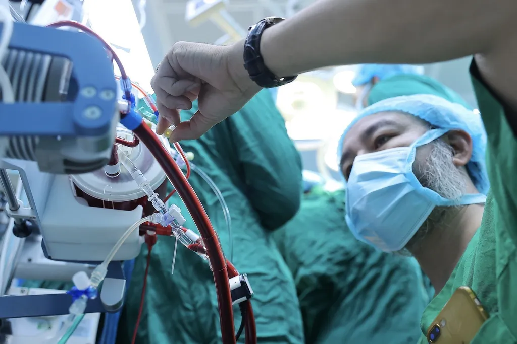 | The medical team installs ECMO, an extracorporeal membrane oxygenation system that temporarily supports heart and lung function by circulating blood outside the body, oxygenating it and removing carbon dioxide before returning it to the patient. |