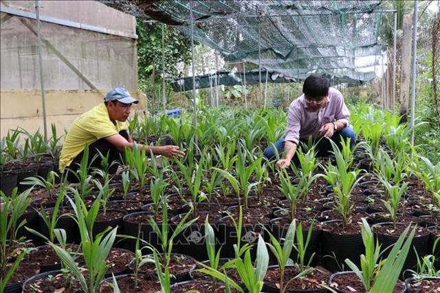 | Staff from the Centre for Applied Biology under the Faculty of Agriculture and Aquaculture at Trà Vinh University monitor growth and inspect the quality of wax coconut seedlings at the university’s experimental site. — VNA/VNS Photo |