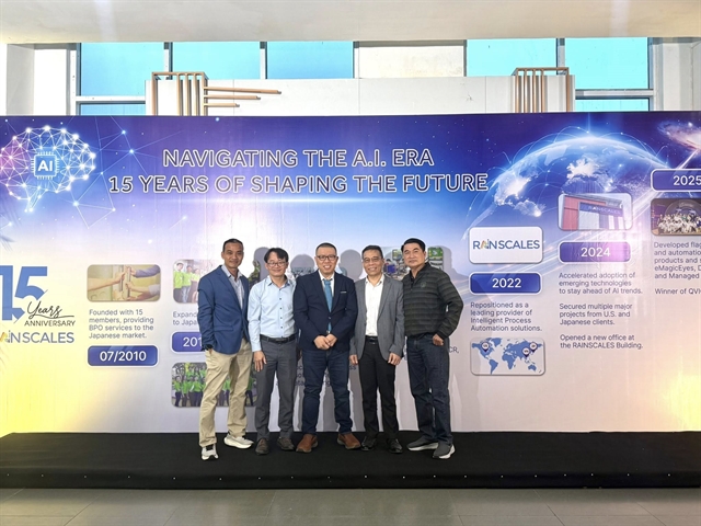 | Trần Mạnh Huy (centre) with partners and colleagues at an event hosted by his technology company. — Photo courtesy of Trần Mạnh Huy |