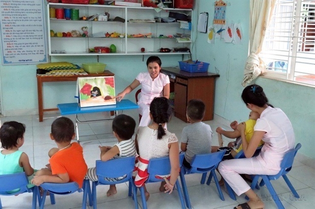 | A preschool teacher assesses a child’s image recognition skills as part of early screening for autism. — VNA/VNS Photo |