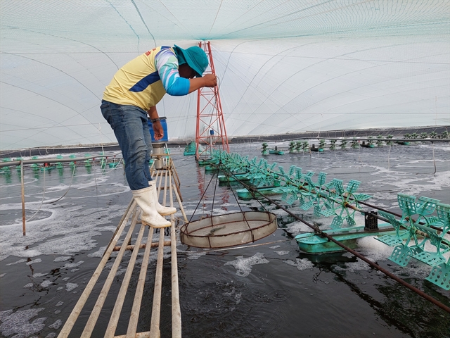 | A high-tech shrimp farming model in Vĩnh Long Province’s Thạnh Phong Commune is equipped with modern technology, including net houses, automatic feeders, oxygen generators, and chlorine aeration systems for water treatment. — VNA/VNS Photo |