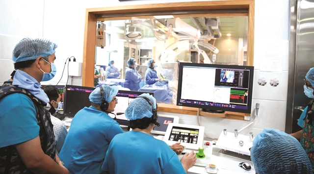 | MODERN MEANS: Doctors at the Cần Thơ City Cardiovascular and Stroke Hospital remotely control a robot to perform a coronary intervention on a patient in the operating room. The procedure marks a milestone for Việt Nam, making it the first country in Southeast Asia to deploy this technology for such a procedure. VNA/VNS Photo Ánh Tuyết |