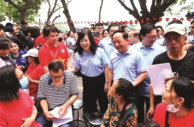 | HEALTHY HABITS: Trịnh Văn Quyết, member of the Politburo, Secretary of the Party Central Committee and head of the Central Publicity and Mass Mobilisation Commission (third right), and Minister of Health Đào Hồng Lan (centre) visit and inquire after the health of Hà Nội residents on April 5. VNA/VNS Photo Minh Đức |