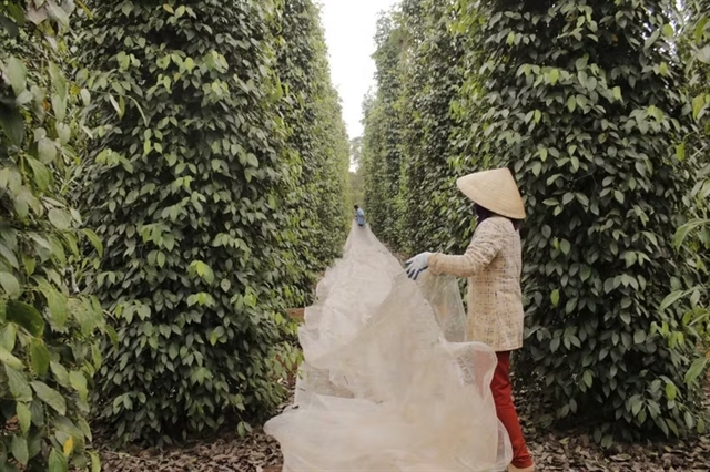 | Amid a shortage of seasonal labour, farmers in HCM City’s main pepper-growing areas are laying nets to collect ripe pepper as it falls. — VNA/VNS Photo Hoàng Nhị |