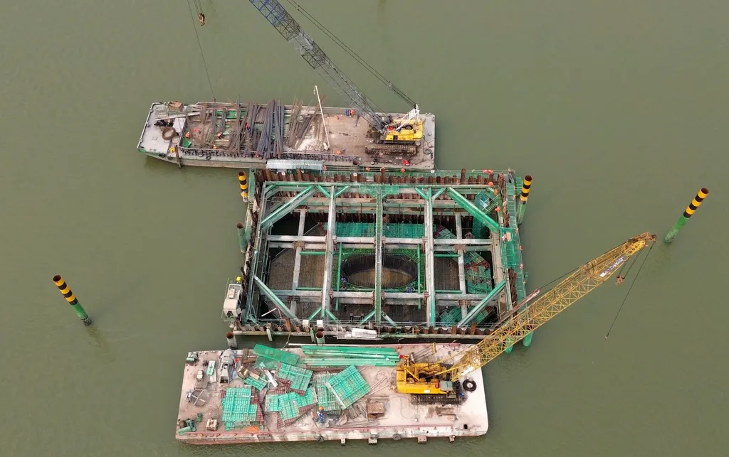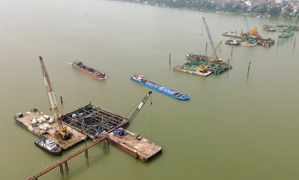 Contractors carry out construction of bridge piers in the middle of the Hồng River.