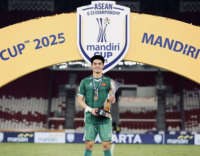 Trần Trung Kiên holds the trophy after Việt Nam won the ASEAN U23 Mandiri Cup in July in Indonesia. |