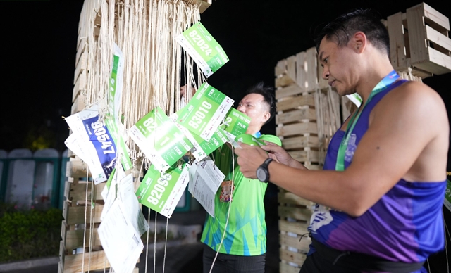 | Runners hang their BIBs on the "Prosperity Tree" to raise funds for bamboo planting to prevent floods in Nghệ An Province. |