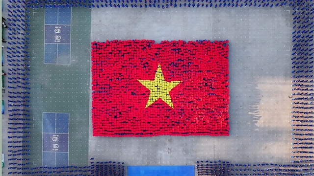 | Students perform in the shape of the Vietnamese national flag. |
